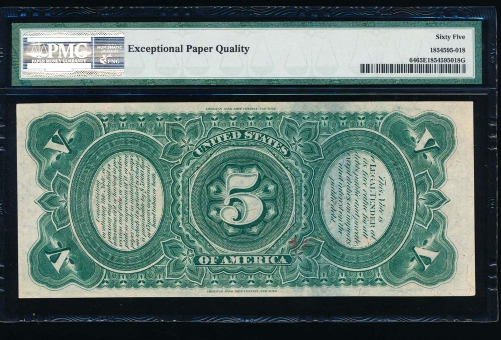 One 1869 $5 Rainbow Woodchopper Legal Tender Note PMG 65EPQ.