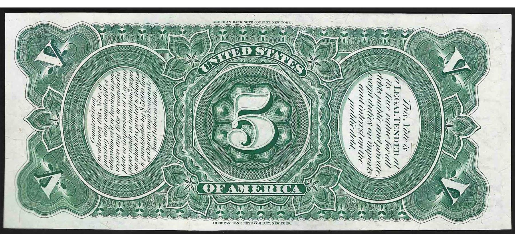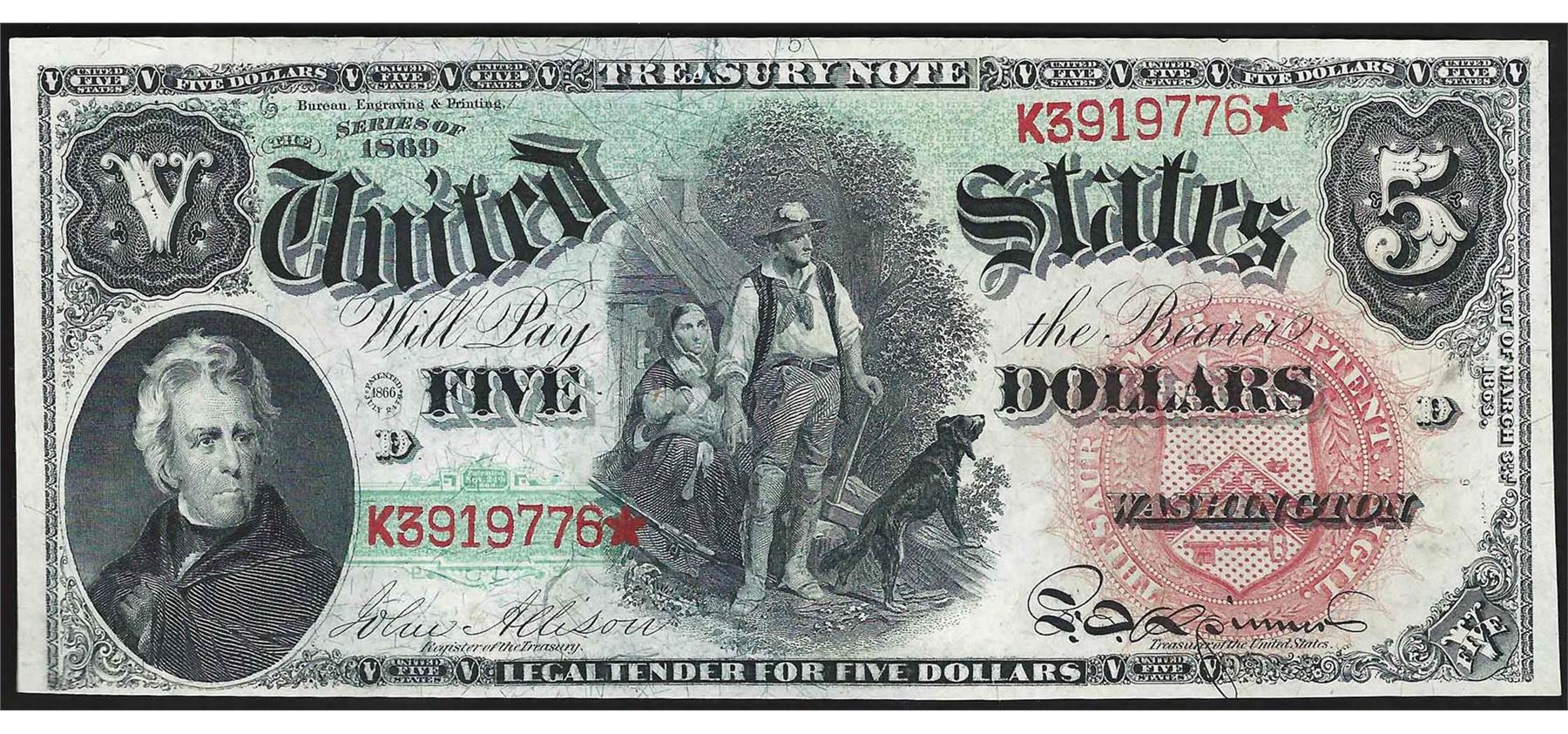 One 1869 $5 Rainbow Woodchopper Legal Tender Note.
