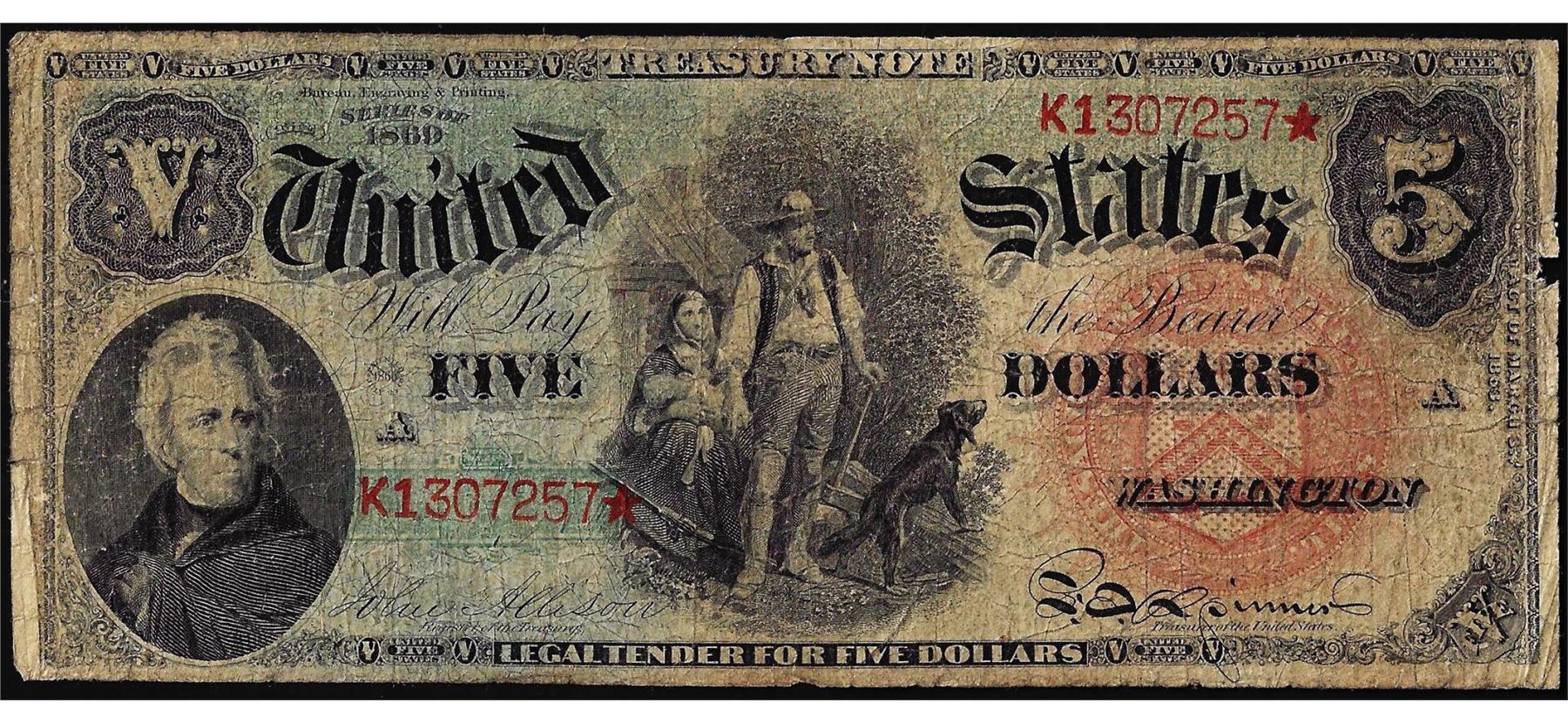 One 1869 $5 Rainbow Woodchopper Legal Tender Note.