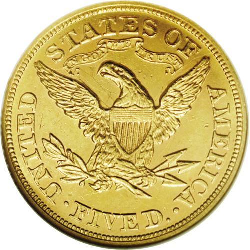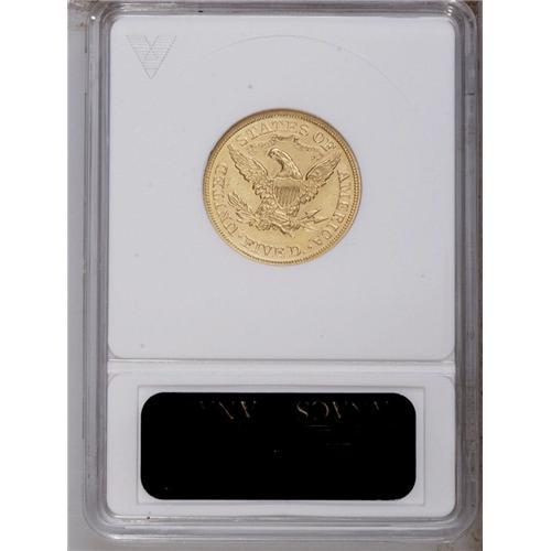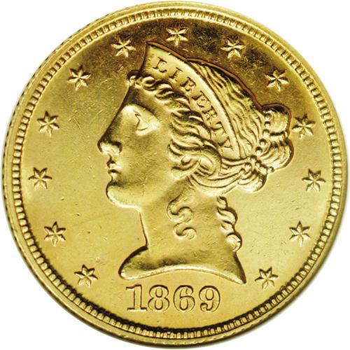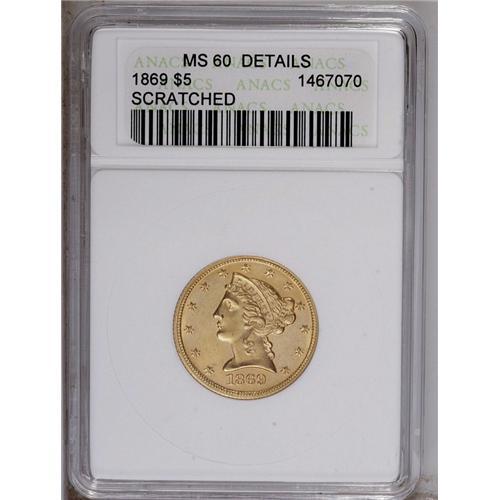 <B>1869<$5>--Scratched--ANACS. MS60 Details.</B></I> A crisply struck but glossy apricot-gold example of this rare Reconstruction-era issue. The luster is slightly subdued, and the reverse field has several faint pinscratches. Since gold coins were driven out of circulation by Gresham's Law and unbacked Federal currency, Philadelphia Mint Half Eagles from the period were produced in very small quantities. The business strike mintage of the 1869 was especially low; a mere 1,760 pieces. The few dozen survivors are mostly in XF and AU grades; NGC and PCGS have certified a total of two pieces as Mint State.