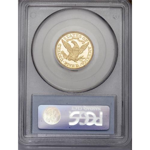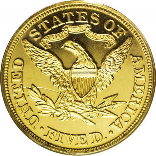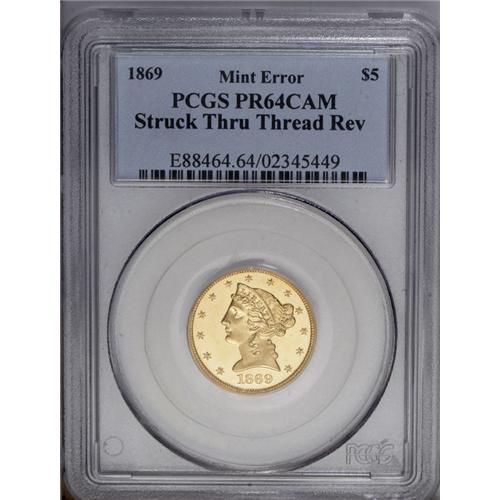 <B>1869 $5 --Struck thru Thread Reverse--PR64 Cameo PCGS.</B></I> This is a spectacular Proof gold half eagle with brilliant yellow-gold surfaces. The devices have frosty yellow luster, with deeply mirrored fields around. Critical examination of the surfaces reveal the slightest wispy hairlines that keep it out of a Gem grade level. Perhaps the most intriguing aspect of this rarity is the reverse indentation, exactly as it was struck. A tiny thread was trapped between the reverse die and the planchet when this coin was struck, and now an indentation in the surface of the reverse remains. It starts at the border above the N of UNITED, curves through the top of I and the upright of T, then curls around through the upper two leaf tips. From there, it is visible through the field and into the eagle's lower feathers, the arrow feather below the shield point, and eventually across the middle arrow shaft, arrow head, and R of AMERICA.<BR> It is not known the exact population of survivors, although the original mintage was limited to just 25 coins. It seems reasonable to assume that about half that number still exist today, or about 10 to 12 coins. We do not recall seeing or hearing of any others that were struck through a piece of thread like this example, although it certainly seems to be a possibility. Alternatively, it is also a possibility that the thread may have remained embedded in the coin's surface for some time, thus suggesting that this example may be unique.