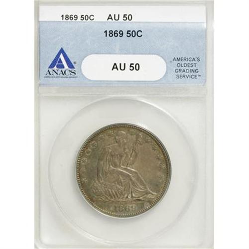 <B>1869 50C AU50 ANACS.</B></I> NGC Census: (5/68). PCGS Population (5/87). Mintage: 795,300. Numismedia Wsl. Price for NGC/PCGS coin in AU50: $175. (#6325)<BR><BR><B>Coin Engraver:</B> Christian Gobrecht<BR><BR><b>Shipping:</b> Coins & Currency (<a target="_blank" href="http://www.heritageauctions.com/common/shipping.php">view shipping information</a>)
