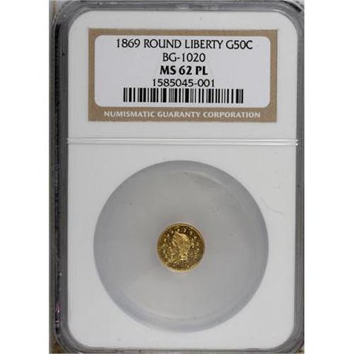 <B>1869 50C BG-1020 Prooflike MS62 NGC.</B></I> NGC Census: (2/1). PCGS Population (0/0). (#710849)<BR><BR><b>Shipping:</b> Coins & Currency (<a target="_blank" href="http://www.heritageauctions.com/common/shipping.php">view shipping information</a>)