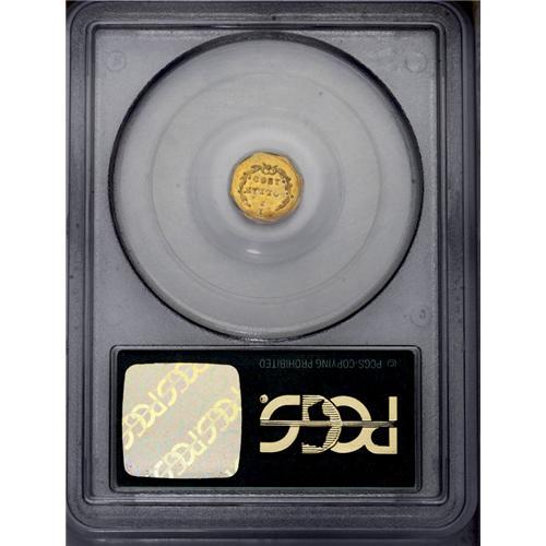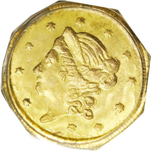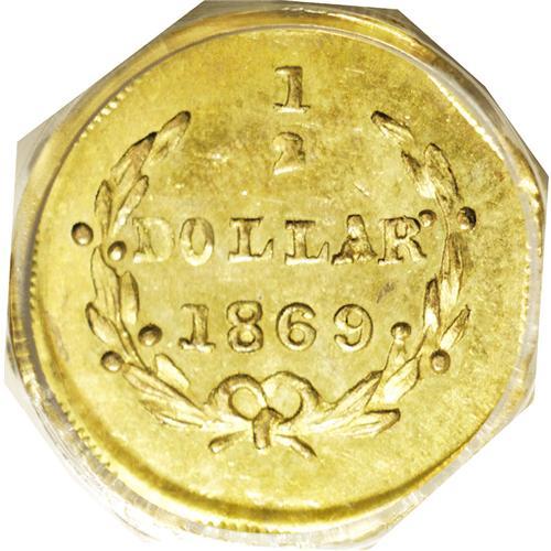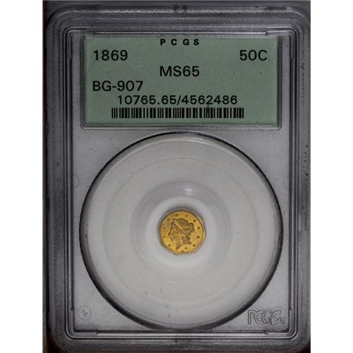 <B>1869<50C> Liberty Octagonal 50 Cents, BG-907, Low R.5, MS65 PCGS.</B></I> A suitably struck apricot-gold Gem with pleasing preservation. The Liberty head motif resembles the anachronistic Type One gold dollar, last struck in 1854. In a green label holder. Population: 11 in 65, 8 finer (2/06). <BR><BR><B>Important notice:</B> Heritage usually auctions material at the rate of 200-250 lots per hour. On some occasions eBay Live bid software or the Internet may not be able to keep up with the pace of the auction. We recommend placing a realistic absentee bid now as insurance to avoid disappointment. Occasionally the auctioneer may eliminate or reject an eBay Live bid, and the auctioneer may also reopen a lot after the close of the eBay live bidding (usually because we missed an audience bid), and may reject your bid even if it shows you as the winning bidder. By bidding via eBay Live, you agree that Heritage may award the lot to another bidder at its sole discretion under the circumstances described above or any other reasonable circumstances. Since eBay bids are not shown to us until we open the lot on the floor, we treat those bids just like floor bids. In most cases the floor responds before the eBay bid is presented to us, due to Internet lag time, so for consistency we have made it a policy that floor bids are always considered first over tie eBay live bids. Also please note that all Heritage lots purchased through eBay Live carry a 20% Buyer's Premium. Please make sure you read the Terms and Conditions before you bid. This lot is being auctioned in conjunction with a live floor auction by Heritage Galleries & Auctioneers. All final auction and invoice information will be supplied by Heritage Galleries & Auctioneers, and all other information should be considered preliminary. Lot:4799 <BR><BR><B>Winning Notification and Billing:</B> After the FINAL session in this auction is complete, Heritage will send e-mail and snail mail invoices. This process normally takes several days. All final auction and invoice information will be supplied by Heritage Galleries & Auctioneers, and all other information should be considered preliminary. <BR><BR>This auction will be conducted on a live auction floor and over the Internet through eBay Live. If you choose to place an absentee bid, please take a moment to <font color='#0000ff'><u><a href='http://pages.ebay.com/liveauctions/help/before/laabsentee.html'>learn how eBay Live absentee bidding works</a></u></font><font color='#000000'>