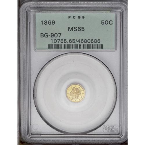 <B>1869<50C> Liberty Octagonal 50 Cents, BG-907, Low R5, MS65 PCGS.</B></I> A lustrous olive-gold premium Gem that is well struck and impressively undisturbed. Encapsulated in a prior generation holder. Population: 11 in 65, 8 finer (4/06).