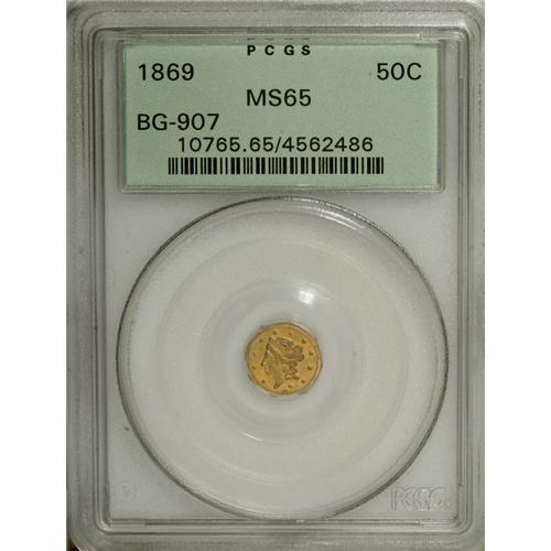 <B>1869 50C Liberty Octagonal 50 Cents, BG-907, Low R5, MS65 PCGS.</B></I> Well struck except for the D in DOLLAR, and the deep apricot patina further increases the eye appeal. The obverse exergue has a lamination of mint origin. Housed in a green label holder. Population: 11 in 65, 8 finer (3/07).<BR><BR><b>Shipping:</b> Coins & Currency (<a target="_blank" href="http://www.heritageauctions.com/common/shipping.php">view shipping information</a>)