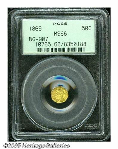 <B>1869<50C> Liberty Octagonal 50 Cents, BG-907, Low R.5, MS66 PCGS.</B></I> Lime-gold in color, this boldly impressed premium Gem has remarkably smooth surfaces. Encapsulated in a green label PCGS holder. Population: 6 in 66, 1 finer (6/05).