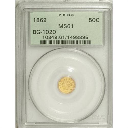 <B>1869 50C Liberty Round 50 Cents, BG-1020, Low R.4, MS61 PCGS.</B></I> PCGS Population (11/42). NGC Census: (2/2). (#10849)<BR><BR><b>Shipping:</b> Coins & Currency (<a target="_blank" href="http://www.heritageauctions.com/common/shipping.php">view shipping information</a>)