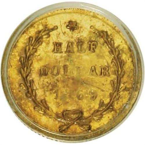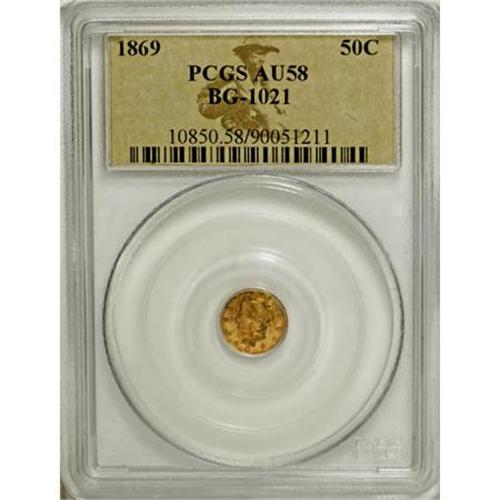 <B>1869 50C Liberty Round 50 Cents, BG-1021, High R.6, AU58 PCGS.</B></I> PCGS Population (3/8). NGC Census: (0/1). (#10850)<BR><BR><b>Shipping:</b> Coins & Currency (<a target="_blank" href="http://www.heritageauctions.com/common/shipping.php">view shipping information</a>)