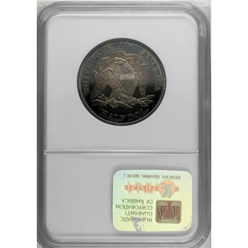 <B>1869<50C> PR63 NGC.</B></I> Well struck with electric-blue and deep crimson patina that turns bright sunset-gold in color when rotated under a light. The reverse is a slightly muted combination of blue and gold colors. A very attractive and seemingly conservatively graded example. Only 600 proofs were struck.