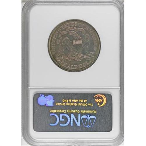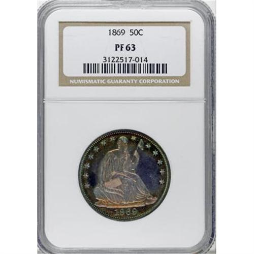 <B>1869 50C PR63 NGC.</B></I> Marked cameo contrast is noted on the obverse, accented by lovely peripheral toning. Both sides are boldly struck and reflective. The reverse is uniformly toned rose gold and the eye appeal is considerably higher than the Select grade would suggest.<BR><BR><B>Coin Engraver:</B> Christian Gobrecht<BR><BR><b>Shipping:</b> Coins & Currency (<a target="_blank" href="http://www.heritageauctions.com/common/shipping.php">view shipping information</a>)