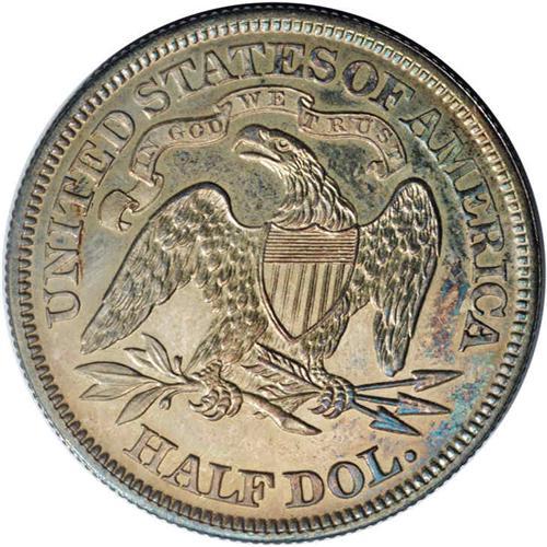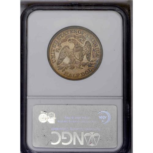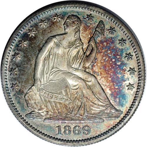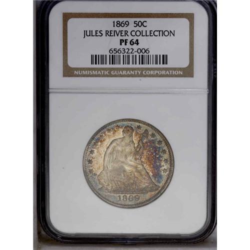 <B>1869<50C> PR64 NGC.</B></I> Vibrant blue-green, plum, and orange colors endow this boldly struck and beautifully preserved near-Gem. An aesthetic treat for the eyes, and also desirable for its scarcity. Only 600 proofs were struck. Population: 45 in 64, 29 finer (9/05). <BR><BR><B>Importa