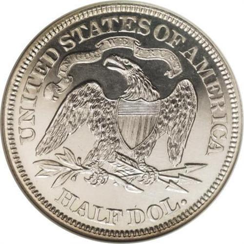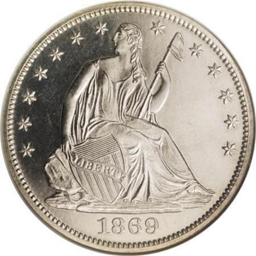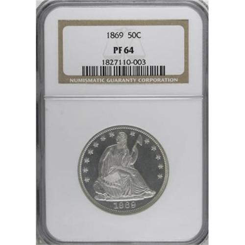 <B>1869 50C PR64 NGC.</B></I> A crisply struck and untoned specimen with noticeable cameo contrast, particularly on the obverse, although not designated as such on the NGC insert. The reverse field has a few wispy hairlines. Just 600 pieces were struck. Census: 46 in 64, 29 finer (8/07).<BR><I>From The Mario Eller Collection, Part One.</B></I><BR><BR><B>Coin Engraver:</B> Christian Gobrecht<BR><BR><b>Shipping:</b> Coins & Currency (<a target="_blank" href="http://www.heritageauctions.com/common/shipping.php">view shipping information</a>)