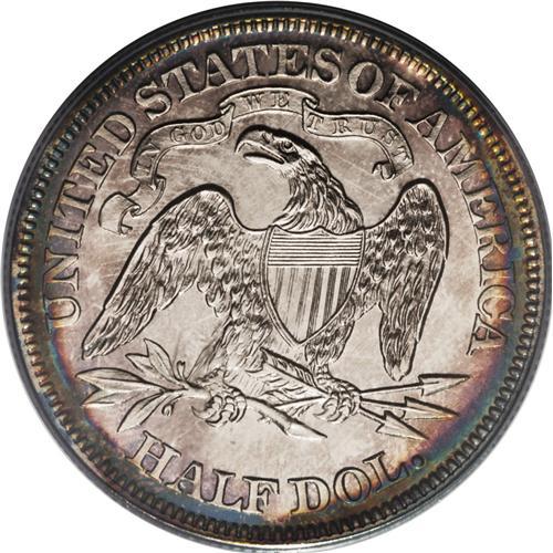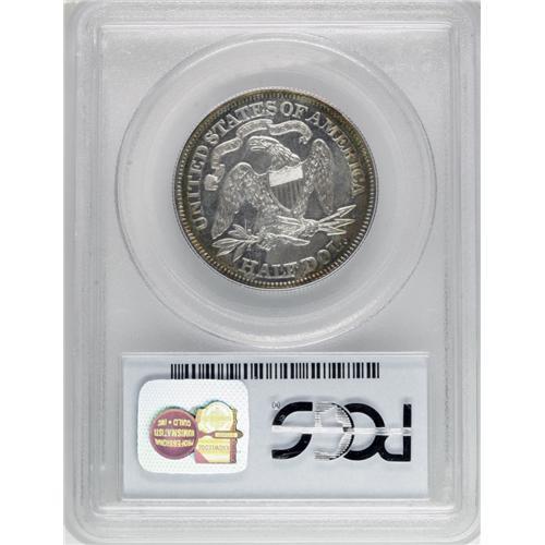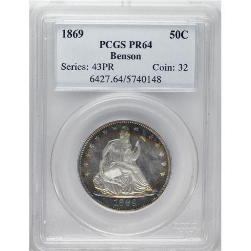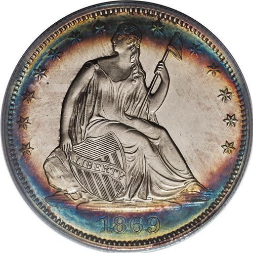 <B>1869 50C PR64 PCGS.</B></I> Ex: Benson Collection. Crescents of cobalt-blue and russet toning on the obverse leave an elliptical opening of brilliance. Similar, but less dramatic colors partially frame the reverse. A few minor contact marks on Liberty's arm seem to preclude a Gem designation.<BR><BR><b>Shipping:</b> Coin/Currency (<a target="_blank" href="http://www.heritageauctions.com/common/shipping.php">view shipping information</a>)