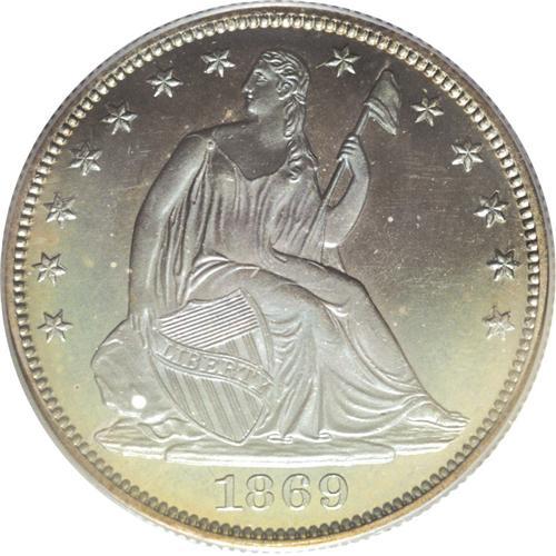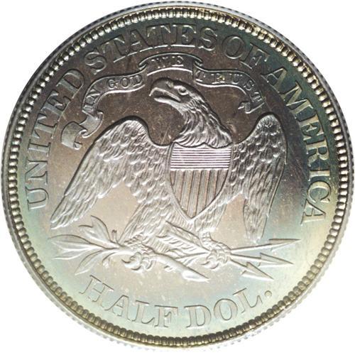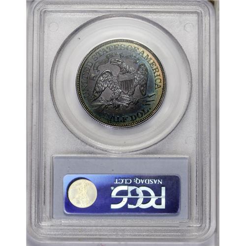 <B>1869<50C> PR65 PCGS.</B></I> This magnificently toned Gem proof offers luscious iridescent ocean-blue and forest-green on the obverse, with the reverse adding a dollop of deep amber-gold. Most of the obverse stars show extra outlines, a characteristic the Garrett coin and others also showed.<BR><I>From The Stephen Stokely #1 PCGS Registry Set of Proof Seated Half Dollars.</B></I>