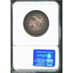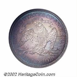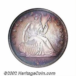 1869 50C PR67 NGC. Ex: P. Kaufman. Breen (1977) lists three different "varieties" of this proof delivery, but we suspect that what he is really describing is different die states of a single die pair. The present example displays outlines around virtually all of the obverse stars, indicating that it is an early die state like the Garrett specimen of the proof 1869 Seated Half Dollar. Both the obverse and reverse of this lovely Superb Gem display warm champagne-gray central toning with lavender and electric-blue iridescence toward the denticles. The glassy, reflective fields and fully brought up devices are fully appreciable, and neither side reveals even a single bothersome handling mark. Since the business strike 1869 Half Dollar is rare in all Mint State grades, this conditionally rare proof variant should be of added significance to advanced date collectors. This coin is one of only two so graded examples at NGC, and there is just one specimen finer (7/02).From the Philip Kaufman Collection. Important notice: We expect to be auctioning lots at the rate of 200-250 per hour. Sometimes eBay Premier live bid software cannot keep up with that pace, so we strongly recommend that you place a realistic proxy bid now as insurance to avoid disappointment. Also please note that all Heritage/CAA lots purchased through eBay Premier carry a 20% Buyer's Premium. Please make sure you read the Terms and Conditions.