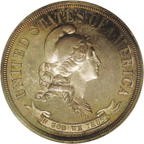 <B>1869<50C> Standard Silver Half Dollar, Judd-743, Pollock-824, High R.6, PR66 NGC.</B></I> A bust of Liberty faces right and wears a cap ornamented with large stars. A ribbon inscribed LIBERTY rests on her shoulder. IN GOD WE TRUST resides within a scroll below, and UNITED STATES OF AMERICA encircles her head. On the reverse, STANDARD SILVER is centered above the familiar wreath of cotton and corn. 50 CENTS is placed within the wreath, and the date is located beneath. William Barber's initial B is recut above the L in LIBERTY, which is also recut (and softly struck), as are both reverse stars. Struck in silver with a plain edge. The brightly reflective surfaces are covered with variegated purple and sea-green toning on the obverse, with bright blue patina on the reverse. Exceptionally well preserved.