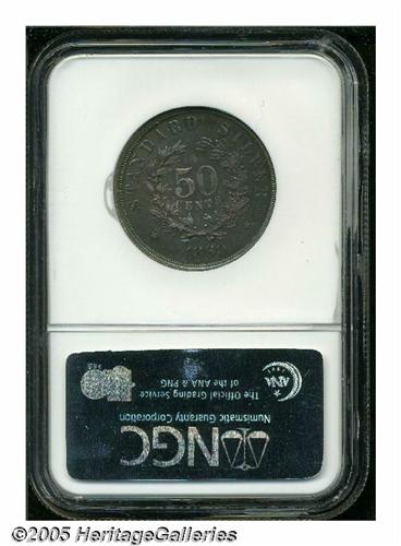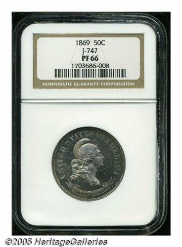 <B>1869<50C> Standard Silver Half Dollar, Judd-747, Pollock-829, High R.7, PR66 NGC.</B></I> A bust of Liberty faces right on the obverse with UNITED STATES OF AMERICA around and IN GOD WE TRUST is on a scroll below. Liberty wears a cap ornamented with two stars. The reverse depicts 50 CENTS within an oak and laurel wreath, STANDARD SILVER is above and 1869 is below. Struck in aluminum with a plain edge. Lightly hairlined, the obverse retains much of the original brilliance in the center with russet and blue toning around the margin. The reverse has deep crimson and cobalt-blue coloration.