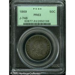 <B>1869 50C Standard Silver Half Dollar, Judd-748, Pollock-831, R.5, PR63 PCGS.</B></I> Standard Silver design with a bust of Liberty facing right on the obverse. Liberty is wearing a diadem inscribed LIBERTY, the legend is around the border, and the motto IN GOD WE TRUST is on a scroll at the bottom. The reverse exhibits the denomination 50 CENTS within a wreath of oak and laurel. STANDARD SILVER is at the periphery, the date 1869 is below the wreath. The left star is repunched. Struck in silver with a reeded edge. The dies are rotated counterclockwise approximately 25 degrees. Deeply toned overall, steel-gray-blue color deepens to russet-brown at the borders. The reflectiveness is somewhat subdued by hairlines and the depth of the patina. Lot:9849