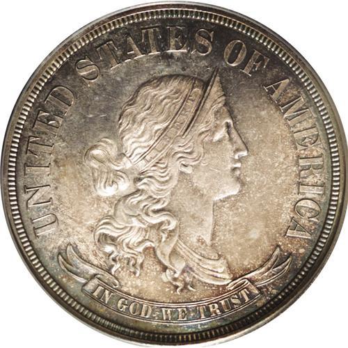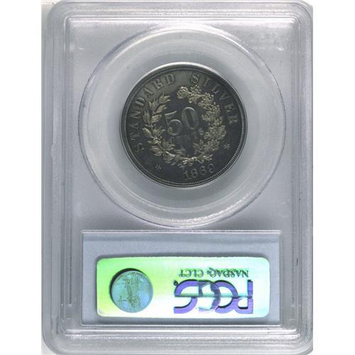<B>1869<50C> Standard Silver Half Dollar, Judd-749, Pollock-832, High R.6, PR64 PCGS.</B></I> Standard Silver half with Liberty facing right on the obverse, UNITED STATES OF AMERICA above, and the motto below. The reverse shows 50 CENTS in the center, surrounded by a wreath of oak and laurel with STANDARD SILVER above and the date below. Struck in silver with a plain edge. This is a richly toned example that shows essentially unmarred surfaces. Smoky-violet and cobalt-blue colors surround the obverse periphery, the reverse is less toned with a mixture of steel-gray shadings. The fields are exceptionally deep in their mirrored reflectivity and the devices are noticeably frosted giving this impressive coin a pronounced contrasting appearance. Fewer than a dozen pieces are believed known of this pattern striking. Population: 4 in 64, 1 finer (7/06).