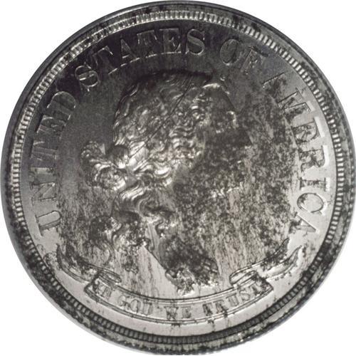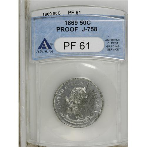 <B>1869 50C Standard Silver Half Dollar, Judd-758, Pollock-842, Low R.7, PR61 ANACS.</B></I> Liberty faces right, with UNITED STATES OF AMERICA above her and IN GOD WE TRUST in a scroll below. The reverse features 50 CENTS inside a wreath, with STANDARD SILVER above and 1869 below. Struck in aluminum with a reeded edge. Mottled dark patina on each side accounts for the grade on this rare pattern.<BR><BR><b>Shipping:</b> Coins & Currency (<a target="_blank" href="http://www.heritageauctions.com/common/shipping.php">view shipping information</a>)
