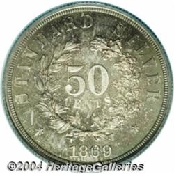 <table><tr><td><table><tr><td>1869 50C Standard Silver Half Dollar, Judd-748, Pollock-831, R.5, PR65 PCGS. Standard Silver design with a bust of Liberty facing right on the obverse. Liberty is wearing a diadem inscribed LIBERTY, the legend is around the border, and the motto IN GOD WE TRUST is on a scroll at the bottom. The reverse exhibits the denomination 50 CENTS within a wreath of oak and laurel. STANDARD SILVER is at the periphery, the date 1869 is below the wreath. Struck in silver with a reeded edge. This is an original Gem that displays rich, variegated, predominately gray-green toning over each side. Deeply reflective beneath the multiple layerings of color. Population: 4 in 65, 0 finer (2/04). <BR><BR><B>Important notice:</B> Heritage usually auctions material at the rate of 200-250 lots per hour. On some occasions eBay Live bid software or the Internet may not be able to keep up with the pace of the auction. We recommend placing a realistic absentee bid now as insurance to avoid disappointment. Occasionally the auctioneer may eliminate or reject an eBay Live bid, and the auctioneer may also reopen a lot after the close of the eBay live bidding (usually because we missed an audience bid), and may reject your bid even if it shows you as the winning bidder. By bidding via eBay Live, you agree that Heritage may award the lot to another bidder at its sole discretion under the circumstances described above or any other reasonable circumstances. Since eBay bids are not shown to us until we open the lot on the floor, we treat those bids just like floor bids. In most cases the floor responds before the eBay bid is presented to us, due to Internet lag time, so for consistency we have made it a policy that floor bids are always considered first over tie eBay live bids. Also please note that all Heritage lots purchased through eBay Live carry a 20% Buyer's Premium. Please make sure you read the Terms and Conditions before you bid. <BR><BR><B>IMPORTANT ANNOUNCEMENT ABOUT RESERVES:</B> Heritage now divulges all reserves on its web site 7 days before every auction. If you want to know whether the reserve on this lot has been met, and if not, what the reserve amount is, please visit this lot page on the HeritageCoin.com web site, or email: bid@HeritageGalleries.com </span></font></td></tr></table></td></tr></table>