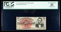 1869, 50¢ Fractional Currency. Fourth Issue, Lincoln portrait. PCGS Extremely Fine 45 Apparent. . Fr-1374. This Lincoln fractional has terrificl colors and inks, although the centering is a touch high and there are some small paper pulls on both sides that are mentioned by PCGS Currency.