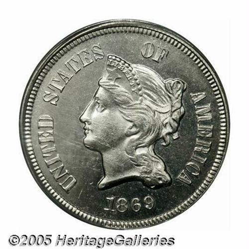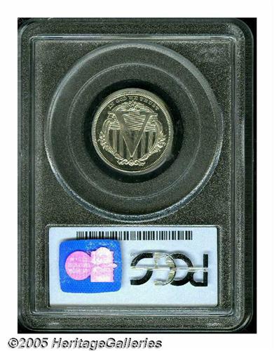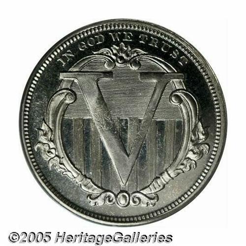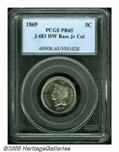 <B>1869<5C> Five Cents, Judd-683, Pollock-762, Low R.7, PR65 PCGS.</B></I> Bass Collection. The obverse resembles the adopted three cent nickel design on a larger planchet, of course. The reverse displays a large V over a wide ornamented frame, IN GOD WE TRUST is above in tiny letters. Struck in nickel with a plain edge. Brilliant throughout and impressively mirrored for a nickel striking. The centers show softness of detail, either from die opposition or the hardness of the nickel composition, or both. Fewer than a dozen examples are believed known of this pattern.<BR><I>Purchased by Harry Bass, Jr. from Abe Kosoff on August 3, 1971; Bass I (Bowers and Merena, 5/99), lot 1048.</B></I><BR><I>From The Western Hills Collection.</B></I>