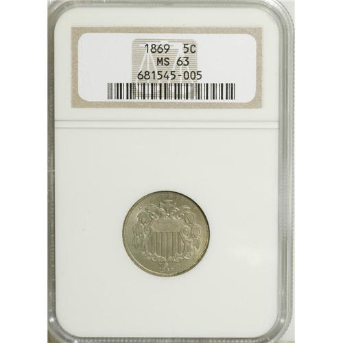 <B>1869 5C MS63 NGC.</B></I> NGC Census: (54/226). PCGS Population (86/178). Mintage: 16,395,000. Numismedia Wsl. Price: $156. (#3796)<BR><BR><b>Shipping:</b> Coins & Currency (<a target="_blank" href="http://www.heritageauctions.com/common/shipping.php">view shipping information</a>)