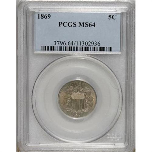 <B>1869 5C MS64 PCGS.</B></I> PCGS Population (121/55). NGC Census: (126/99). Mintage: 16,395,000. Numismedia Wsl. Price for NGC/PCGS coin in MS64: $252. (#3796)<BR><BR><b>Shipping:</b> Coins & Currency (<a target="_blank" href="http://www.heritageauctions.com/common/shipping.php">view shipping information</a>)