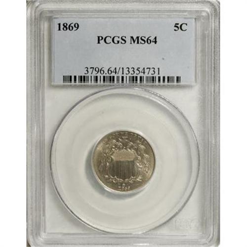 <B>1869 5C MS64 PCGS.</B></I> . PCGS Population (127/56). NGC Census: (128/100). Mintage: 16,395,000. Numismedia Wsl. Price for NGC/PCGS coin in MS64: $290. (#3796)<BR><BR><B>Coin Engraver:</B> James B. Longacre<BR><BR><b>Shipping:</b> Coins & Currency (<a target="_blank" href="http://www.heritageauctions.com/common/shipping.php">view shipping information</a>)