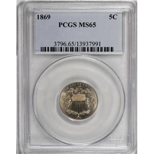 <B>1869 5C MS65 PCGS.</B></I> An uncommonly lustrous Gem representative of this earlier No Rays Shield nickel issue, well struck with even gold and peach patina over each side. Well-preserved and highly appealing. Population: 46 in 65, 10 finer (8/07).<BR><BR><B>Coin Engraver:</B> James B. Longacre<BR><BR><b>Shipping:</b> Coins & Currency (<a target="_blank" href="http://www.heritageauctions.com/common/shipping.php">view shipping information</a>)