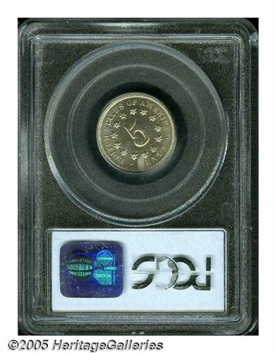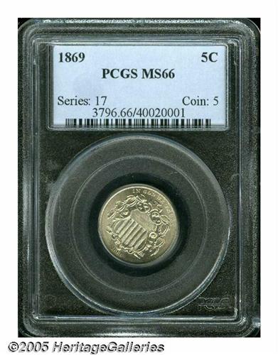 <B>1869<5C> MS66 PCGS.</B></I> A surprisingly challenging issue in high grades. The strike is bold and the surfaces display a bright, satiny sheen with no flaws worthy of singular mention. Worth a close look and a premium bid. Population: 9 in 66, 0 finer (5/05).
