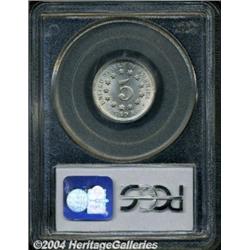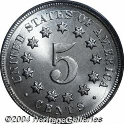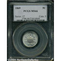 <B>1869<5C> MS66 PCGS.</B></I> A boldly struck and brilliant Gem that has impressive luster and pleasing preservation. The date is entered too high, as the 8 touches the ball of the shield. Both sides have numerous spindly die cracks about the peripheral areas. Population: 8 in 66, 0 finer (6/04). <BR><BR><B>Important notice:</B> Heritage usually auctions material at the rate of 200-250 lots per hour. On some occasions eBay Live bid software or the Internet may not be able to keep up with the pace of the auction. We recommend placing a realistic absentee bid now as insurance to avoid disappointment. Occasionally the auctioneer may eliminate or reject an eBay Live bid, and the auctioneer may also reopen a lot after the close of the eBay live bidding (usually because we missed an audience bid), and may reject your bid even if it shows you as the winning bidder. By bidding via eBay Live, you agree that Heritage may award the lot to another bidder at its sole discretion under the circumstances described above or any other reasonable circumstances. Since eBay bids are not shown to us until we open the lot on the floor, we treat those bids just like floor bids. In most cases the floor responds before the eBay bid is presented to us, due to Internet lag time, so for consistency we have made it a policy that floor bids are always considered first over tie eBay live bids. Also please note that all Heritage lots purchased through eBay Live carry a 20% Buyer's Premium. Please make sure you read the Terms and Conditions before you bid. </span></font></tr></table></td></tr></table>