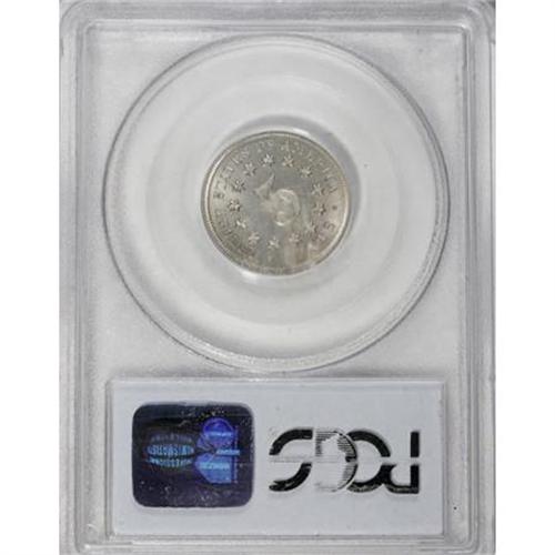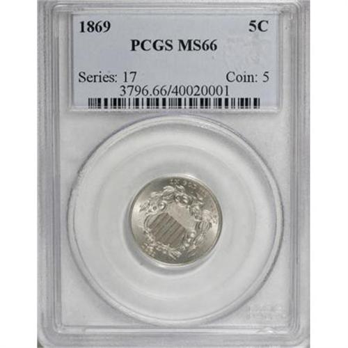 <B>1869 5C MS66 PCGS.</B></I> A surprisingly challenging issue in high grades with PCGS grading no examples finer than the example presented here. The strike is strong and the surfaces display a bright, satiny sheen with no flaws worthy of singular mention. Worth a close look and a premium bid. Population: 10 in 66, 0 finer (11/07).<BR><BR><B>Coin Engraver:</B> James B. Longacre<BR><BR><b>Shipping:</b> Coins & Currency (<a target="_blank" href="http://www.heritageauctions.com/common/shipping.php">view shipping information</a>)