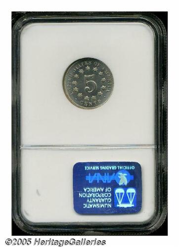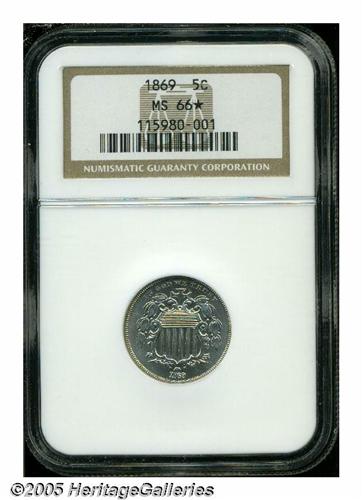 <B>1869<5C> MS66 <S NGC.</B></I> This piece has beautiful bright surfaces that radiate dazzling luster, and show no significant contact marks. A squiggly as-struck lint mark is noted in the lower right (facing) obverse field. The design features are well struck, though a couple of the star centers are a tad soft. Population: 1 in 66 with Star, 1 finer (5/05).<BR><I>From The Western Hills Collection.</B></I>