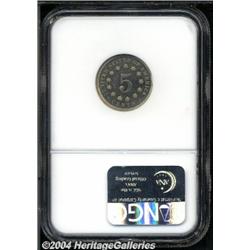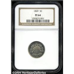 <B>1869<5C> PR64 NGC.</B></I> A scarcer early proof, with deeply reflective, mirror surfaces, an uneven coating of milky patina on both sides, and generally well struck, immaculately preserved surfaces. A striking coin, particularly on the obverse, but with a couple of incompletely detailed stars on the reverse. <BR><BR><B>Important notice:</B> Heritage usually auctions material at the rate of 200-250 lots per hour. On some occasions eBay Live bid software or the Internet may not be able to keep up with the pace of the auction. We recommend placing a realistic absentee bid now as insurance to avoid disappointment. Occasionally the auctioneer may eliminate or reject an eBay Live bid, and the auctioneer may also reopen a lot after the close of the eBay live bidding (usually because we missed an audience bid), and may reject your bid even if it shows you as the winning bidder. By bidding via eBay Live, you agree that Heritage may award the lot to another bidder at its sole discretion under the circumstances described above or any other reasonable circumstances. Since eBay bids are not shown to us until we open the lot on the floor, we treat those bids just like floor bids. In most cases the floor responds before the eBay bid is presented to us, due to Internet lag time, so for consistency we have made it a policy that floor bids are always considered first over tie eBay live bids. Also please note that all Heritage lots purchased through eBay Live carry a 20% Buyer's Premium. Please make sure you read the Terms and Conditions before you bid.