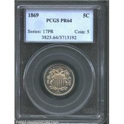 <TR><TD width="100%"><TABLE cellSpacing=1 cellPadding=3 width="100%" border=0><TBODY><TR><TD width="100%" bgColor=#79735c><FONT face=arial color=#ffffff size=3><B>Description</B> </FONT></TD></TR><TR><TD width="100%" bgColor=#ffffff><FONT face=arial size=2><B>1869 5C PR64 PCGS.</B></I> Bright and crisply defined overall. This one appears as if it could have been struck yesterday.<BR><I>From the Brian Loncar Collection.</B></I> </FONT></TD></TR></TBODY></TABLE></TD></TR></TBODY></TABLE><BR><A name=PricesRealized></A><TABLE cellSpacing=0 cellPadding=0 width="100%" bgColor=#000000 border=0><TBODY><TR><TD width="100%"><TABLE cellSpacing=1 cellPadding=3 width="100%" border=0><TBODY><TR><TD width="100%" bgColor=#79735c><A name=PR><FONT face=arial color=#ffffff size=3><B>Previous Prices from Heritage Auctions</B> </FONT></A></TD></TR><TR><TD bgColor=#f6f6ed><TABLE cellSpacing=0 cellPadding=0 width="100%" border=1><TBODY><TR><TD align=middle width="33%"><B>Date</B></TD><TD align=middle width="33%"><B>Service</B></TD><TD align=middle width="33%"><B>Price</B></TD></TR><TR bgColor=whitesmoke><TD width="33%"><B>05/15/2001</B></TD><TD width="33%">PCGS</TD><TD width="33%">$350.00</TD></TR><TR bgColor=whitesmoke><TD width="33%"><B>04/11/1997</B></TD><TD width="33%">PCGS</TD><TD width="33%">$357.50</TD></TR><TR bgColor=whitesmoke><TD width="33%"><B>11/23/2002</B></TD><TD width="33%">NGC</TD><TD width="33%">$310.50</TD></TR><TR bgColor=whitesmoke><TD width="33%"><B>11/07/1998</B></TD><TD width="33%">NGC</TD><TD width="33%">$297.00</TD></TR><TR bgColor=whitesmoke><TD width="33%"><B>10/01/1998</B></TD><TD width="33%">ANACS</TD><TD width="33%">$523.00</TD></TR><TR bgColor=whitesmoke><TD width="33%"><B>04/15/2003</B></TD><TD width="33%">PCGS</TD><TD width="33%">$379.50</TD></TR></TBODY></TABLE></TD></TR><TR><TD bgColor=#ffffff><FONT face=arial size=1 ?>PLEASE NOTE: All prices realized reflect the final hammer price PLUS the buyer's premium in auctions that charge a buyer's premium. Each item has a notation at the top of the listing indicating whether that lot included a buyer's premium. Example: A item that sells with a final hammer price of $100 and a 20% buyer's premium will display with a price realized of $120. All information listed is intended to be as accurate as possible, but errors are possible. Please use this guide carefully and inform us of any inaccuracies. </FONT></TD></TR></TBODY></TABLE></TD></TR></TBODY></TABLE><BR><TABLE cellSpacing=0 cellPadding=0 width="100%" bgColor=#000000 border=0><TBODY><TR><TD width="100%"><TABLE cellSpacing=1 cellPadding=3 width="100%" border=0><TBODY><TR><TD width="100%" bgColor=#79735c colSpan=6><FONT face=arial color=#ffffff size=3><B>Price Guide*</B> </FONT></TD></TR><TR bgColor=#f6f6ed><TD align=middle><B>Grade</B> </TD><TD align=middle><B>Coin World<BR>(Trends)</B> </TD><TD align=middle><B>Numismedia<BR>Retail</B> </TD><TD align=middle><B>Numismedia<BR>Wholesale</B> </TD><TD align=middle><B>Coin<BR>Universe</B> </TD><TD align=middle><B>Heritage<BR>Value Index</B> </TD></TR><TR bgColor=#ffffff><TD align=middle>63</TD><TD align=right>---</TD><TD align=right>$330.00</TD><TD align=right>$275.00</TD><TD align=right>$275.00</TD><TD align=right>$195.25</TD></TR><TR style="FONT-WEIGHT: bold" bgColor=#cccfdd><TD align=middle>64</TD><TD align=right>---</TD><TD align=right>$575.00</TD><TD align=right>$460.00</TD><TD align=right>$365.00</TD><TD align=right>$351.50</TD></TR><TR bgColor=#ffffff><TD align=middle>65</TD><TD align=right>---</TD><TD align=right>---</TD><TD align=right>$800.00</TD><TD align=right>$1,250.00</TD><TD align=right>$710.42</TD></TR><TR bgColor=#ffffff><TD colSpan=6><FONT size=1>*All information listed is intended to be as accurate as possible, but errors are possible. No item may be returned or refused based on this information which is provided as a service to our customers. You should contact each pricing source directly to determine the accuracy of this information. </FONT></TD></TR></TBODY></TABLE></TD></TR></TBODY></TABLE><BR><TABLE cellSpacing=0 cellPadding=0 width="100%" bgColor=#000000 border=0><TBODY><TR><TD width="100%"><TABLE cellSpacing=1 cellPadding=3 width="100%" border=0><TBODY><TR><TD width="100%" bgColor=#79735c><FONT face=arial color=#ffffff size=3><B>Population Guide</B> </FONT></TD></TR><TR bgColor=#ffffff><TD align=middle><!-- Begin Output of Population Grid--><TABLE cellSpacing=0 cellPadding=0 width="100%" border=0><TBODY><TR><TD vAlign=center><TABLE cellSpacing=0 width="100%" border=1 cellsadding="3"><TBODY><TR><TD vAlign=center><TABLE cellSpacing=0 cellPadding=3 width="100%" border=1><TBODY><TR><TD vAlign=center align=middle bgColor=#f0f1e8 colSpan=2 <CENTER><FONT face=Arial size=2><B>PCGS Pop </B></FONT><CENTER></CENTER></TD><TD vAlign=center align=middle bgColor=#f0f1e8 colSpan=2><CENTER><FONT face=Arial size=2><B>NGC Pop</B></CENTER></FONT></TD></TR><TR><TD vAlign=center><FONT face=Arial size=2>(64)</FONT> </TD><TD vAlign=center align=right><FONT face=Arial size=2>125</FONT> </TD><TD vAlign=center><FONT face=Arial size=2>(64)</FONT> </TD><TD vAlign=center align=right><FONT face=Arial size=2>92</FONT> </TD></TR><TR><TD vAlign=center><FONT face=Arial size=2>(>64)</FONT> </TD><TD vAlign=center align=right><FONT face=Arial size=2>96</FONT> </TD><TD vAlign=center><FONT face=Arial size=2>(>64)</FONT> </TD><TD vAlign=center align=right><FONT face=Arial size=2>107</FONT> </TD></TR></TBODY></TABLE></TD></TR></TBODY></TABLE></TD></TR></TBODY></TABLE><!-- End Output of Population Grid--></TD></TR></TBODY></TABLE></TD></TR></TBODY></TABLE><BR><TABLE cellSpacing=0 cellPadding=0 width="100%" bgColor=#000000 border=0><TBODY><TR> Important notice: We expect to be auctioning lots at the rate of 200-250 per hour. On occasion eBay live bid software cannot keep up with the pace of the auctions where 4-5 lots per minute can hammer down, so we recommend that you place a realistic absentee bid now as insurance to avoid disappointment. Also please 