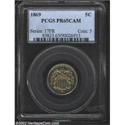 1869 5C PR65 Cameo PCGS. Fully reflective fields are set against frosted devices, producing the came