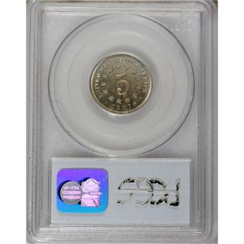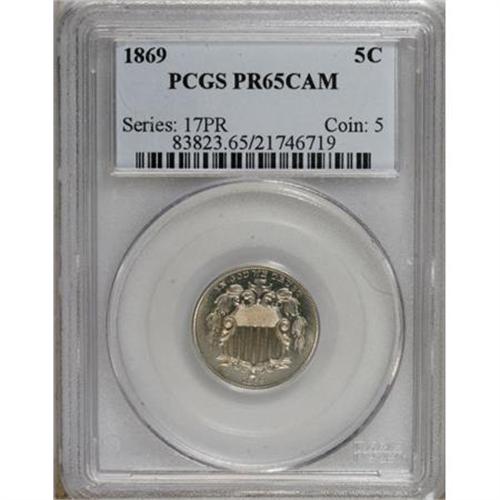 <B>1869 5C PR65 Cameo PCGS.</B></I> A hint of golden-tan in the centers is the only toning on this lovely Gem. Boldly struck with appreciable contrast. Population: 8 in 65 Cameo, 10 finer. (6/07)<BR><BR><b>Shipping:</b> Coins & Currency (<a target="_blank" href="http://www.heritageauctions.com/common/shipping.php">view shipping information</a>)