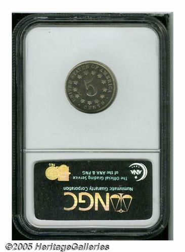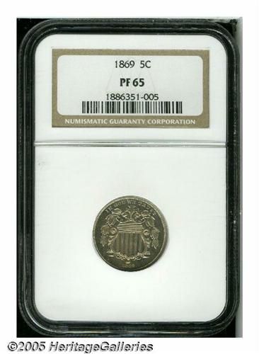 <B>1869<5C> PR65 NGC.</B></I> An early proof issue in the Shield nickel series and one of only 600 pieces struck in this format in 1869. This is a mostly brilliant example that displays surprising depth of reflectivity (for a nickel product) in the fields.
