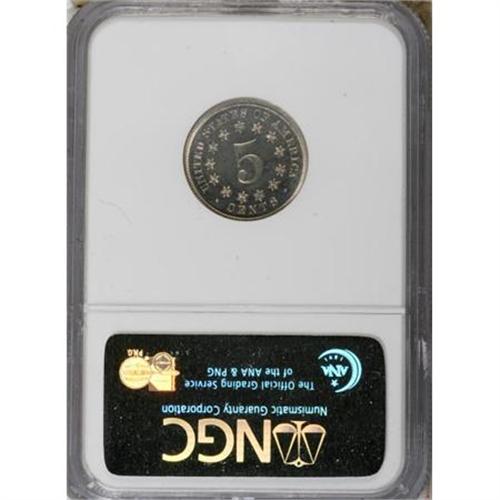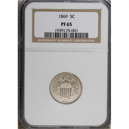 <B>1869 5C PR65 NGC.</B></I> A wondrous Gem with reflective devices and deeply mirrored fields, this piece retains full nickel-gray brilliance on both sides. The top star on the reverse is a trifle weak, but all other design elements on each side are bold. From an unknown but doubtless small proof mintage, likely only a few hundred coins.<BR><BR><b>Shipping:</b> Coins & Currency (<a target="_blank" href="http://www.heritageauctions.com/common/shipping.php">view shipping information</a>)