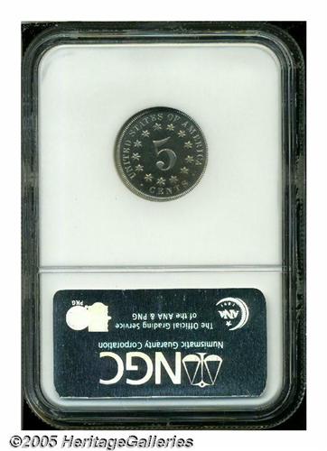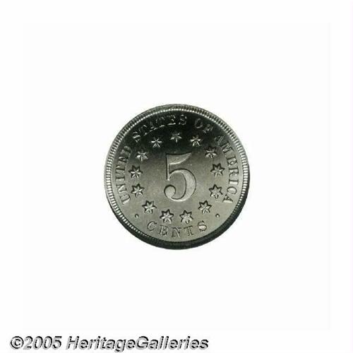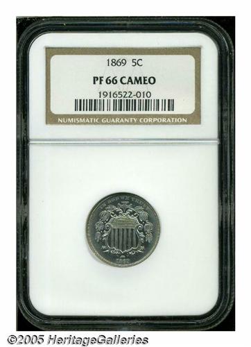 <B>1869<5C> PR66 Cameo NGC.</B></I> Bright, lightly toned watery mirrors exhibit a fair degree of contrast for an early Nickel issue and are solidly in the Gem category. Pastel-gold colorations are seen at selected peripheral areas. Population: 3 in 66 Cameo, 0 finer (6/05).