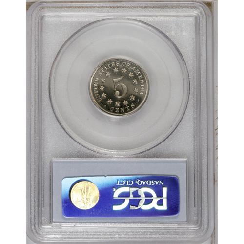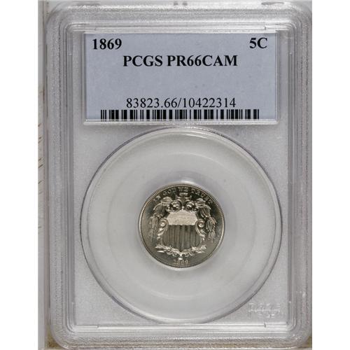<B>1869 5C PR66 Cameo PCGS.</B></I> A lovely and well-preserved example that has standout contrast. The surfaces have just a hint of gold-gray patina. Population: 8 in 66 Cameo, 1 finer (10/06).<BR><BR><b>Shipping:</b> Coin/Currency (<a target="_blank" href="http://www.heritageauctions.com/common/shipping.php">view shipping information</a>)