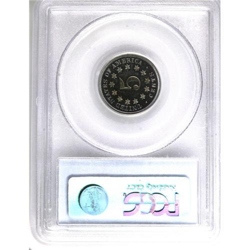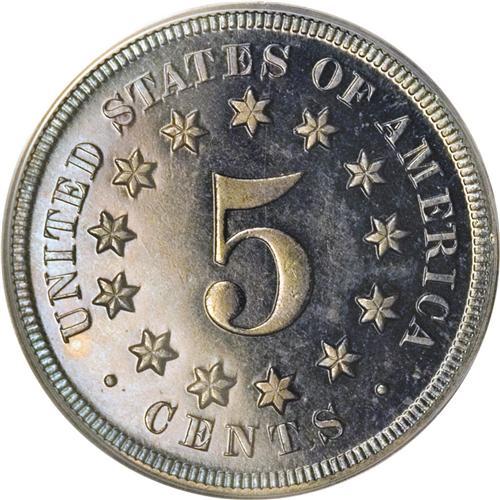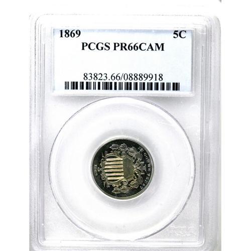 <B>1869<5C> PR66 Cameo PCGS.</B></I> An aesthetically desirable Gem proof with exceptional cameo contrast on each side. Pristine mirrored fields frame the lustrous devices. The nickel-gray surfaces of this example are hidden beneath gold and lilac toning. A few stars on the reverse are a trifle weak, but all other design features are boldly defined.<BR><I>From The Troy Wiseman Collection.</B></I>