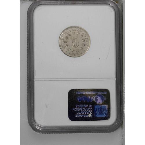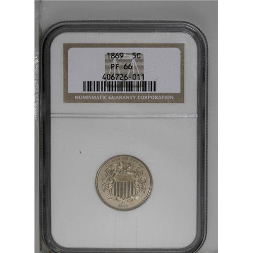 <B>1869<5C> PR66 NGC.</B></I> A moderately reflective gray-gold proof from the transition period when the Philadelphia Mint produced both nickels and half dimes. A few small spots are visible in and around the shield.