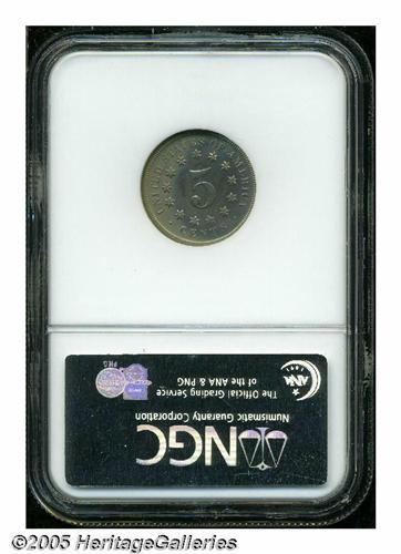 <B>1869<5C> PR66 NGC.</B></I> Nicely mirrored beneath subtle reddish-gold and lemon-yellow patina that is well dispersed on the obverse and takes on an arc pattern on the left side of the reverse. Population: 32 in 66, 6 finer (4/05).