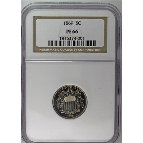 <B>1869<5C> PR66 NGC.</B></I> This is a gorgeous Premium Gem with brilliant gray surfaces and wispy champagne toning. Few specimens can match the aesthetic appeal of this example.