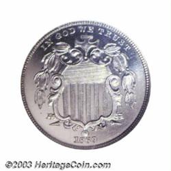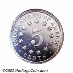 <TR><TD width="100%"><TABLE cellSpacing=1 cellPadding=3 width="100%" border=0><TBODY><TR><TD width="100%" bgColor=#79735c><FONT face=arial color=#ffffff size=3><B>Description</B> </FONT></TD></TR><TR><TD width="100%" bgColor=#ffffff><FONT face=arial size=2><B>1869 5C PR67 NGC.</B></I> A scarce issue in all grades (Peters and Mohon, 1995, rank it fifth in rarity in the proof Shield Nickel series), the 1869 is undeniably rare as a Superb Gem. Deeply mirrored in the fields, this untoned, brilliant specimen is fully brought up in virtually all areas. Smooth and essentially pristine, the surfaces are undisturbed by even a single noticeable blemish. Both major grading services combined have seen only seven 1869 Nickels in PR67. There are none finer (4/03). </FONT></TD></TR></TBODY></TABLE></TD></TR></TBODY></TABLE><BR><A name=PricesRealized></A><TABLE cellSpacing=0 cellPadding=0 width="100%" bgColor=#000000 border=0><TBODY><TR><TD width="100%"><TABLE cellSpacing=1 cellPadding=3 width="100%" border=0><TBODY><TR><TD width="100%" bgColor=#79735c><A name=PR><FONT face=arial color=#ffffff size=3><B>Previous Prices from Heritage Auctions</B> </FONT></A></TD></TR><TR><TD bgColor=#f6f6ed><TABLE cellSpacing=0 cellPadding=0 width="100%" border=1><TBODY><TR><TD align=middle width="33%"><B>Date</B></TD><TD align=middle width="33%"><B>Service</B></TD><TD align=middle width="33%"><B>Price</B></TD></TR><TR bgColor=whitesmoke><TD width="33%"><B>09/28/2002</B></TD><TD width="33%">NGC</TD><TD width="33%">$3,450.00</TD></TR><TR bgColor=whitesmoke><TD width="33%"><B>05/03/2003</B></TD><TD width="33%">NGC</TD><TD width="33%">$2,185.00</TD></TR></TBODY></TABLE></TD></TR><TR><TD bgColor=#ffffff><FONT face=arial size=1 ?>PLEASE NOTE: All prices realized reflect the final hammer price PLUS the buyer's premium in auctions that charge a buyer's premium. Each item has a notation at the top of the listing indicating whether that lot included a buyer's premium. Example: A item that sells with a final hammer price of $100 and a 20% buyer's premium will display with a price realized of $120. All information listed is intended to be as accurate as possible, but errors are possible. Please use this guide carefully and inform us of any inaccuracies. </FONT></TD></TR></TBODY></TABLE></TD></TR></TBODY></TABLE><BR><TABLE cellSpacing=0 cellPadding=0 width="100%" bgColor=#000000 border=0><TBODY><TR><TD width="100%"><TABLE cellSpacing=1 cellPadding=3 width="100%" border=0><TBODY><TR><TD width="100%" bgColor=#79735c colSpan=6><FONT face=arial color=#ffffff size=3><B>Price Guide*</B> </FONT></TD></TR><TR bgColor=#f6f6ed><TD align=middle><B>Grade</B> </TD><TD align=middle><B>Coin World<BR>(Trends)</B> </TD><TD align=middle><B>Numismedia<BR>Retail</B> </TD><TD align=middle><B>Numismedia<BR>Wholesale</B> </TD><TD align=middle><B>Coin<BR>Universe</B> </TD><TD align=middle><B>Heritage<BR>Value Index</B> </TD></TR><TR bgColor=#ffffff><TD align=middle>66</TD><TD align=right>---</TD><TD align=right>---</TD><TD align=right>$1,750.00</TD><TD align=right>$2,100.00</TD><TD align=right>$1,360.00</TD></TR><TR style="FONT-WEIGHT: bold" bgColor=#cccfdd><TD align=middle>67</TD><TD align=right>---</TD><TD align=right>---</TD><TD align=right>---</TD><TD align=right>---</TD><TD align=right>---</TD></TR><TR bgColor=#ffffff><TD align=middle>68</TD><TD align=right>---</TD><TD align=right>---</TD><TD align=right>---</TD><TD align=right>---</TD><TD align=right>---</TD></TR><TR bgColor=#ffffff><TD colSpan=6><FONT size=1>*All information listed is intended to be as accurate as possible, but errors are possible. No item may be returned or refused based on this information which is provided as a service to our customers. You should contact each pricing source directly to determine the accuracy of this information. </FONT></TD></TR></TBODY></TABLE></TD></TR></TBODY></TABLE><BR><TABLE cellSpacing=0 cellPadding=0 width="100%" bgColor=#000000 border=0><TBODY><TR><TD width="100%"><TABLE cellSpacing=1 cellPadding=3 width="100%" border=0><TBODY><TR><TD width="100%" bgColor=#79735c><FONT face=arial color=#ffffff size=3><B>Population Guide</B> </FONT></TD></TR><TR bgColor=#ffffff><TD align=middle><!-- Begin Output of Population Grid--><TABLE cellSpacing=0 cellPadding=0 width="100%" border=0><TBODY><TR><TD vAlign=center><TABLE cellSpacing=0 width="100%" border=1 cellsadding="3"><TBODY><TR><TD vAlign=center><TABLE cellSpacing=0 cellPadding=3 width="100%" border=1><TBODY><TR><TD vAlign=center align=middle bgColor=#f0f1e8 colSpan=2 <CENTER><FONT face=Arial size=2><B>PCGS Pop </B></FONT><CENTER></CENTER></TD><TD vAlign=center align=middle bgColor=#f0f1e8 colSpan=2><CENTER><FONT face=Arial size=2><B>NGC Pop</B></CENTER></FONT></TD></TR><TR><TD vAlign=center><FONT face=Arial size=2>(67)</FONT> </TD><TD vAlign=center align=right><FONT face=Arial size=2>1</FONT> </TD><TD vAlign=center><FONT face=Arial size=2>(67)</FONT> </TD><TD vAlign=center align=right><FONT face=Arial size=2>6</FONT> </TD></TR><TR><TD vAlign=center><FONT face=Arial size=2>(>67)</FONT> </TD><TD vAlign=center align=right><FONT face=Arial size=2>0</FONT> </TD><TD vAlign=center><FONT face=Arial size=2>(>67)</FONT> </TD><TD vAlign=center align=right><FONT face=Arial size=2>0</FONT> </TD></TR></TBODY></TABLE></TD></TR></TBODY></TABLE></TD></TR></TBODY></TABLE><!-- End Output of Population Grid--></TD></TR></TBODY></TABLE></TD></TR></TBODY></TABLE><BR><TABLE cellSpacing=0 cellPadding=0 width="100%" bgColor=#000000 border=0><TBODY><TR> Important notice: We expect to be auctioning lots at the rate of 200-250 per hour. On occasion eBay live bid software cannot keep up with the pace of the auctions where 4-5 lots per minute can hammer down, so we recommend that you place a realistic absentee bid now as insurance to avoid disappointment. Also please note that all Heritage/CAA lots purchased through eBay Live carry a 20% Buyer's Premium. Please make sure you read the Terms and Conditions.
