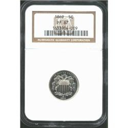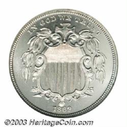 <TABLE cellSpacing=0 cellPadding=0 width="100%" bgColor=#000000 border=0><TBODY><TR><TD width="100%"><TABLE cellSpacing=1 cellPadding=3 width="100%" border=0><TBODY><TR><TD width="100%" bgColor=#79735c><FONT face=arial color=#ffffff size=3><B>Description</B> </FONT></TD></TR><TR><TD width="100%" bgColor=#ffffff><FONT face=arial size=2><B>1869 5C PR67 NGC.</B></I> A brilliant and magnificently preserved Superb Gem that is well struck aside from the star above the T in CENTS. The obverse seemingly has cameo contrast, as does much of the reverse except for the prominent 5 that comprises the denomination. NGC, however, has not designated this impressive specimen as Cameo. Population: 6 in 67, 0 finer (7/03). </FONT></TD></TR></TBODY></TABLE></TD></TR></TBODY></TABLE><BR><A name=PricesRealized></A><TABLE cellSpacing=0 cellPadding=0 width="100%" bgColor=#000000 border=0><TBODY><TR><TD width="100%"><TABLE cellSpacing=1 cellPadding=3 width="100%" border=0><TBODY><TR><TD width="100%" bgColor=#79735c><A name=PR><FONT face=arial color=#ffffff size=3><B>Previous Prices from Heritage Auctions</B> </FONT></A></TD></TR><TR><TD bgColor=#f6f6ed><TABLE cellSpacing=0 cellPadding=0 width="100%" border=1><TBODY><TR><TD align=middle width="33%"><B>Date</B></TD><TD align=middle width="33%"><B>Service</B></TD><TD align=middle width="33%"><B>Price</B></TD></TR><TR bgColor=whitesmoke><TD width="33%"><B>01/10/1998</B></TD><TD width="33%">PCGS</TD><TD width="33%">$2,185.00</TD></TR><TR bgColor=whitesmoke><TD width="33%"><B>03/01/2003</B></TD><TD width="33%">NGC</TD><TD width="33%">$1,782.50</TD></TR><TR bgColor=whitesmoke><TD width="33%"><B>05/03/2003</B></TD><TD width="33%">NGC</TD><TD width="33%">$2,185.00</TD></TR></TBODY></TABLE></TD></TR><TR><TD bgColor=#ffffff><FONT face=arial size=1 ?>PLEASE NOTE: All prices realized reflect the final hammer price PLUS the buyer's premium in auctions that charge a buyer's premium. Each item has a notation at the top of the listing indicating whether that lot included a buyer's premium. Example: A item that sells with a final hammer price of $100 and a 20% buyer's premium will display with a price realized of $120. All information listed is intended to be as accurate as possible, but errors are possible. Please use this guide carefully and inform us of any inaccuracies. </FONT></TD></TR></TBODY></TABLE></TD></TR></TBODY></TABLE><BR><TABLE cellSpacing=0 cellPadding=0 width="100%" bgColor=#000000 border=0><TBODY><TR><TD width="100%"><TABLE cellSpacing=1 cellPadding=3 width="100%" border=0><TBODY><TR><TD width="100%" bgColor=#79735c colSpan=6><FONT face=arial color=#ffffff size=3><B>Price Guide*</B> </FONT></TD></TR><TR bgColor=#f6f6ed><TD align=middle><B>Grade</B> </TD><TD align=middle><B>Coin World<BR>(Trends)</B> </TD><TD align=middle><B>Numismedia<BR>Retail</B> </TD><TD align=middle><B>Numismedia<BR>Wholesale</B> </TD><TD align=middle><B>Coin<BR>Universe</B> </TD><TD align=middle><B>Heritage<BR>Value Index</B> </TD></TR><TR bgColor=#ffffff><TD align=middle>66</TD><TD align=right>---</TD><TD align=right>---</TD><TD align=right>$1,750.00</TD><TD align=right>$2,100.00</TD><TD align=right>$1,360.00</TD></TR><TR style="FONT-WEIGHT: bold" bgColor=#cccfdd><TD align=middle>67</TD><TD align=right>---</TD><TD align=right>---</TD><TD align=right>---</TD><TD align=right>---</TD><TD align=right>---</TD></TR><TR bgColor=#ffffff><TD align=middle>68</TD><TD align=right>---</TD><TD align=right>---</TD><TD align=right>---</TD><TD align=right>---</TD><TD align=right>---</TD></TR><TR bgColor=#ffffff><TD colSpan=6><FONT size=1>*All information listed is intended to be as accurate as possible, but errors are possible. No item may be returned or refused based on this information which is provided as a service to our customers. You should contact each pricing source directly to determine the accuracy of this information. </FONT></TD></TR></TBODY></TABLE></TD></TR></TBODY></TABLE><BR><TABLE cellSpacing=0 cellPadding=0 width="100%" bgColor=#000000 border=0><TBODY><TR><TD width="100%"><TABLE cellSpacing=1 cellPadding=3 width="100%" border=0><TBODY><TR><TD width="100%" bgColor=#79735c><FONT face=arial color=#ffffff size=3><B>Population Guide</B> </FONT></TD></TR><TR bgColor=#ffffff><TD align=middle><!-- Begin Output of Population Grid--><TABLE cellSpacing=0 cellPadding=0 width="100%" border=0><TBODY><TR><TD vAlign=center><TABLE cellSpacing=0 width="100%" border=1 cellsadding="3"><TBODY><TR><TD vAlign=center><TABLE cellSpacing=0 cellPadding=3 width="100%" border=1><TBODY><TR><TD vAlign=center align=middle bgColor=#f0f1e8 colSpan=2 <CENTER><FONT face=Arial size=2><B>PCGS Pop </B></FONT><CENTER></CENTER></TD><TD vAlign=center align=middle bgColor=#f0f1e8 colSpan=2><CENTER><FONT face=Arial size=2><B>NGC Pop</B></CENTER></FONT></TD></TR><TR><TD vAlign=center><FONT face=Arial size=2>(67)</FONT> </TD><TD vAlign=center align=right><FONT face=Arial size=2>1</FONT> </TD><TD vAlign=center><FONT face=Arial size=2>(67)</FONT> </TD><TD vAlign=center align=right><FONT face=Arial size=2>6</FONT> </TD></TR><TR><TD vAlign=center><FONT face=Arial size=2>(>67)</FONT> </TD><TD vAlign=center align=right><FONT face=Arial size=2>0</FONT> </TD><TD vAlign=center><FONT face=Arial size=2>(>67)</FONT> </TD><TD vAlign=center align=right><FONT face=Arial size=2>0</FONT> </TD></TR></TBODY></TABLE></TD></TR></TBODY></TABLE></TD></TR></TBODY></TABLE><!-- End Output of Population Grid--> Important notice: Heritage usually auctions material at the rate of 200-250 lots per hour. On some occasions eBay Live bid software or the Internet may not be able to keep up with the pace of the auction. We recommend placing a realistic absentee bid now as insurance to avoid disappointment. Occasionally the auctioneer may eliminate or reject an eBay Live bid, and the auctioneer may also reopen a lot after the close of the eBay live bidding (usually because we missed an audience bid), and may reject your bid even if it shows you as the winning bidder. B